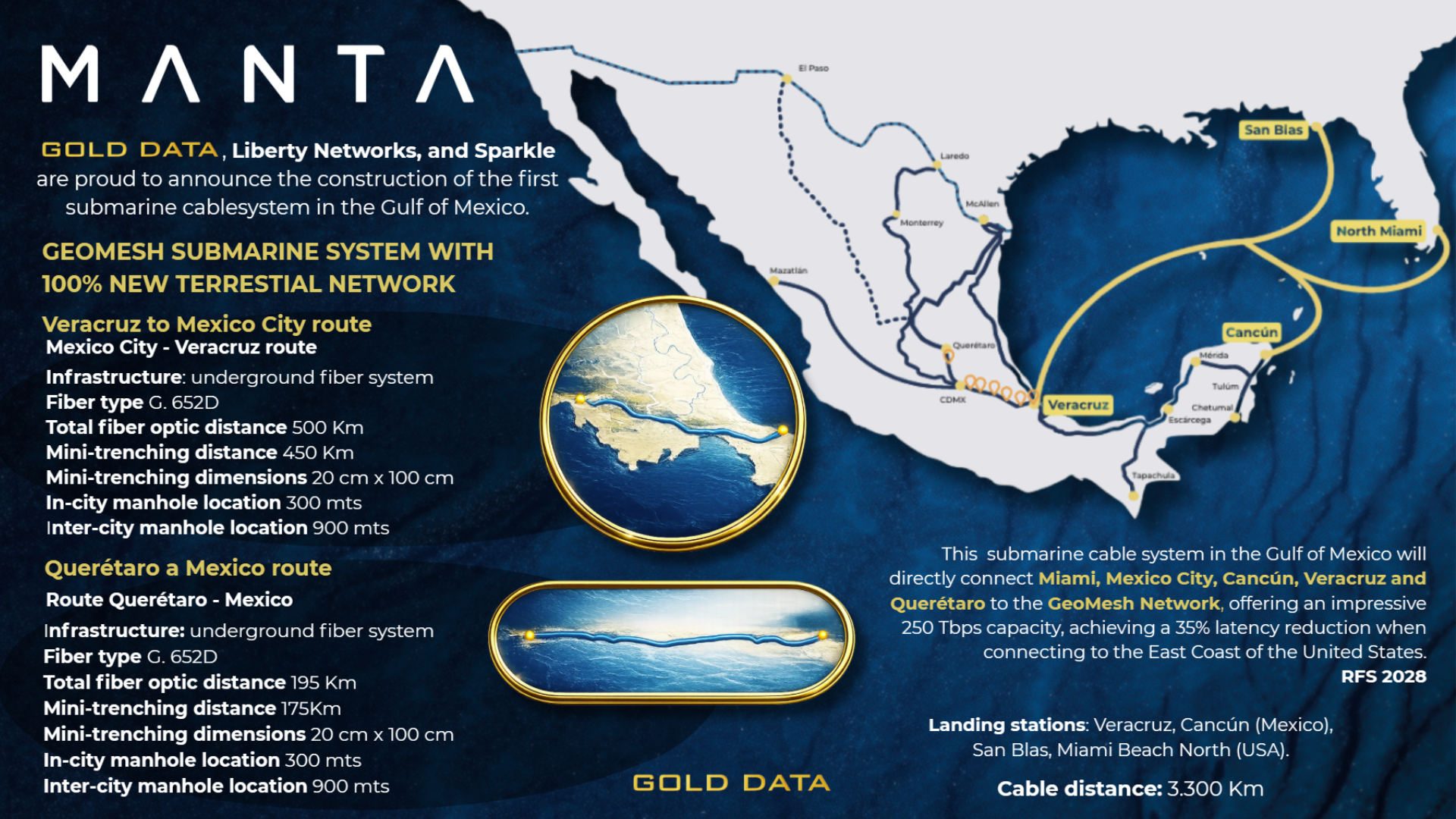 Red DWDM hasta 1.2 Tbps, latencias ultra bajas (ej. NYSE–Bovespa), infraestructura terrestre y submarina. En construcción: MANTA, un sistema GeoMesh de 250 Tbps entre México y EE.UU.